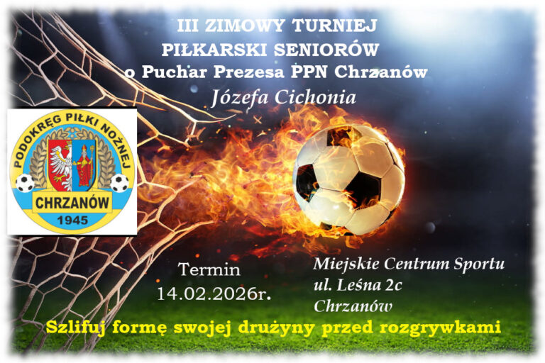 KOMUNIKAT Nr KG.PPN.Chr/20/II/ SEZON 2025-2026 Z posiedzenia Komisji Gier Podokręgu Chrzanów w dniu 14.01.2026 roku Komisja Szkolenia Podokręgu Chrzanów organizuję dla drużyn seniorów „ III Turniej Piłkarski o Puchar Prezesa J. Cichonia „ który odbędzie się w dniu 14 lutego 2026 r. w godz. 9.00 – 16.00 na boisku ze sztuczną…